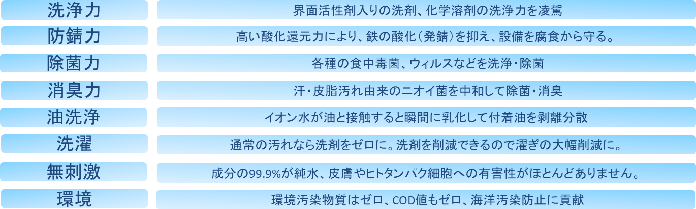 | 1 成分の99.83%が水の安全性 | 界面活性剤・化学物質ゼロ BOD・CODの含有量ゼロ 無色・無臭・無刺激 引火・爆発の危険性ゼロ |