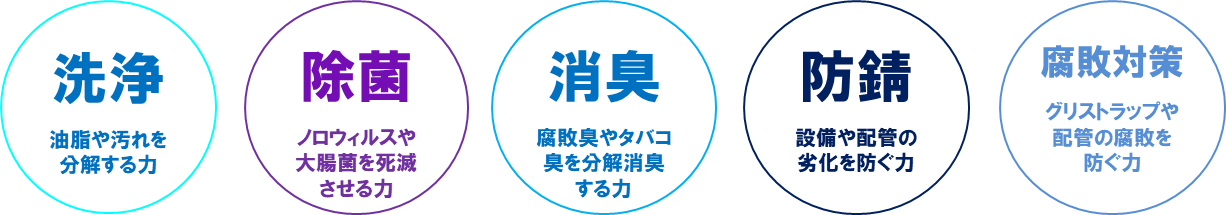| 4 強い防錆効果 | 酸化を防ぎ、金属腐食が出ない 不導態膜の効果で防錆力が持続 各種加工用水の腐敗を防止 消臭効果を発揮 |