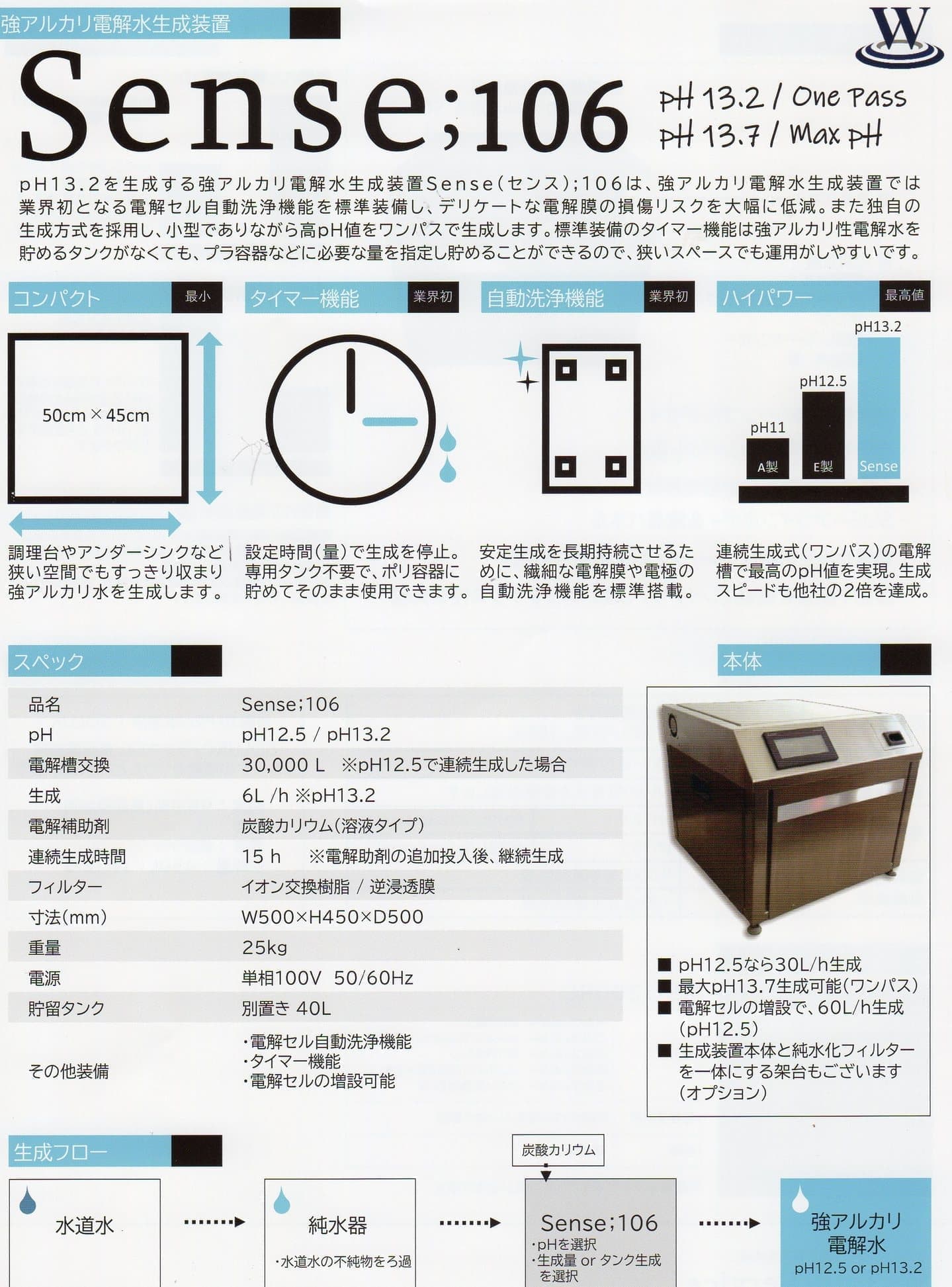 独自の生成方法を採用し、小型でありながら高pH値をワンパスで生成でき、狭いスペースでも運用がしやすい仕様です。